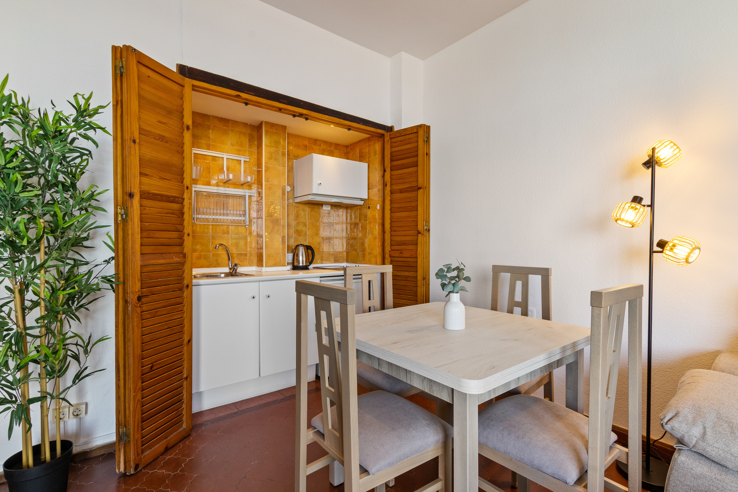 • Cocina integrada al salón, totalmente equipada para cocinar como en casa.
