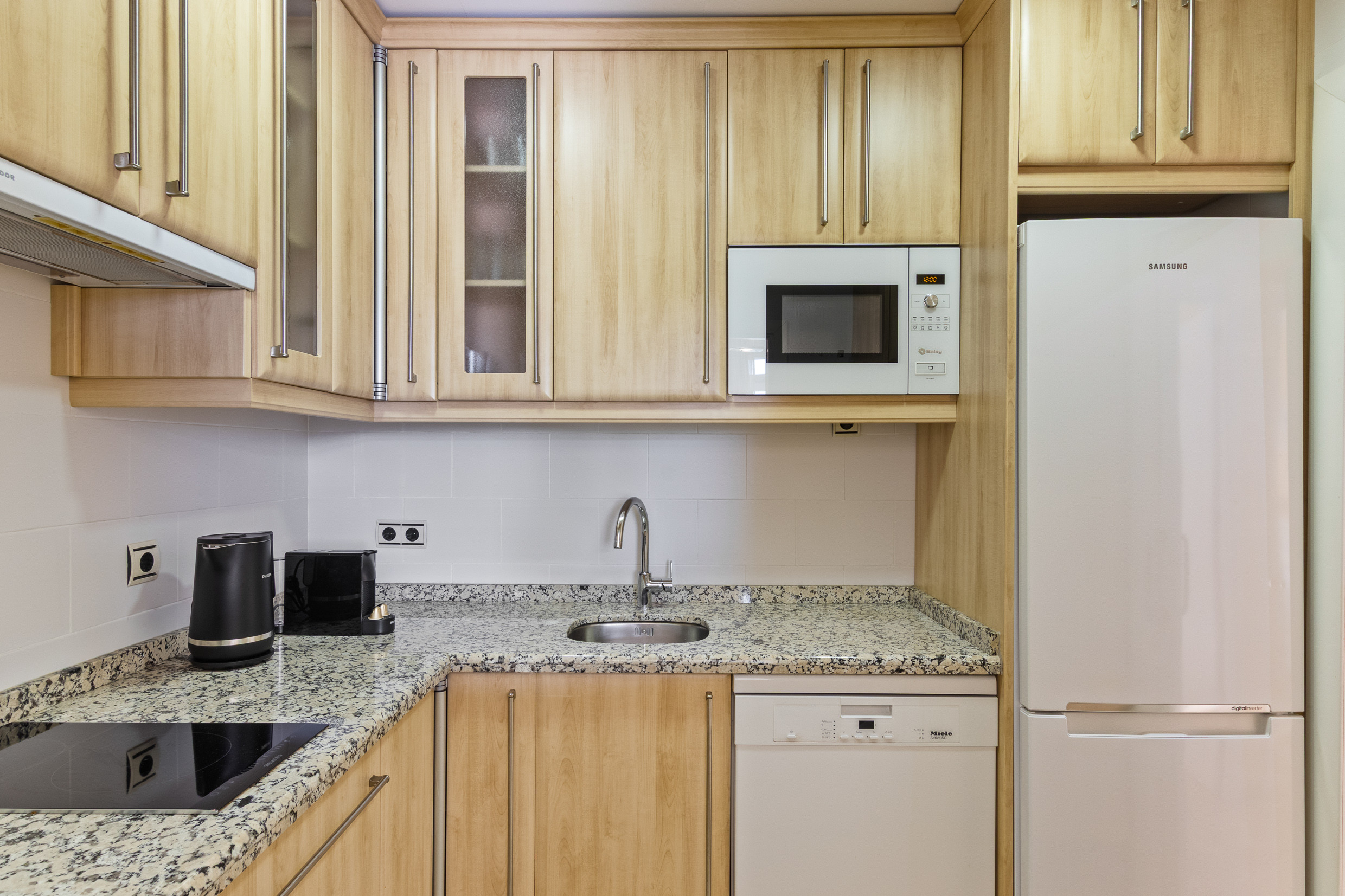 La cocina es el sueño de un chef, totalmente equipada con refrigerador, horno, microondas, tostadora, hervidor y todos los utensilios necesarios. Aquí, la preparación de las comidas se convierte en un placer.