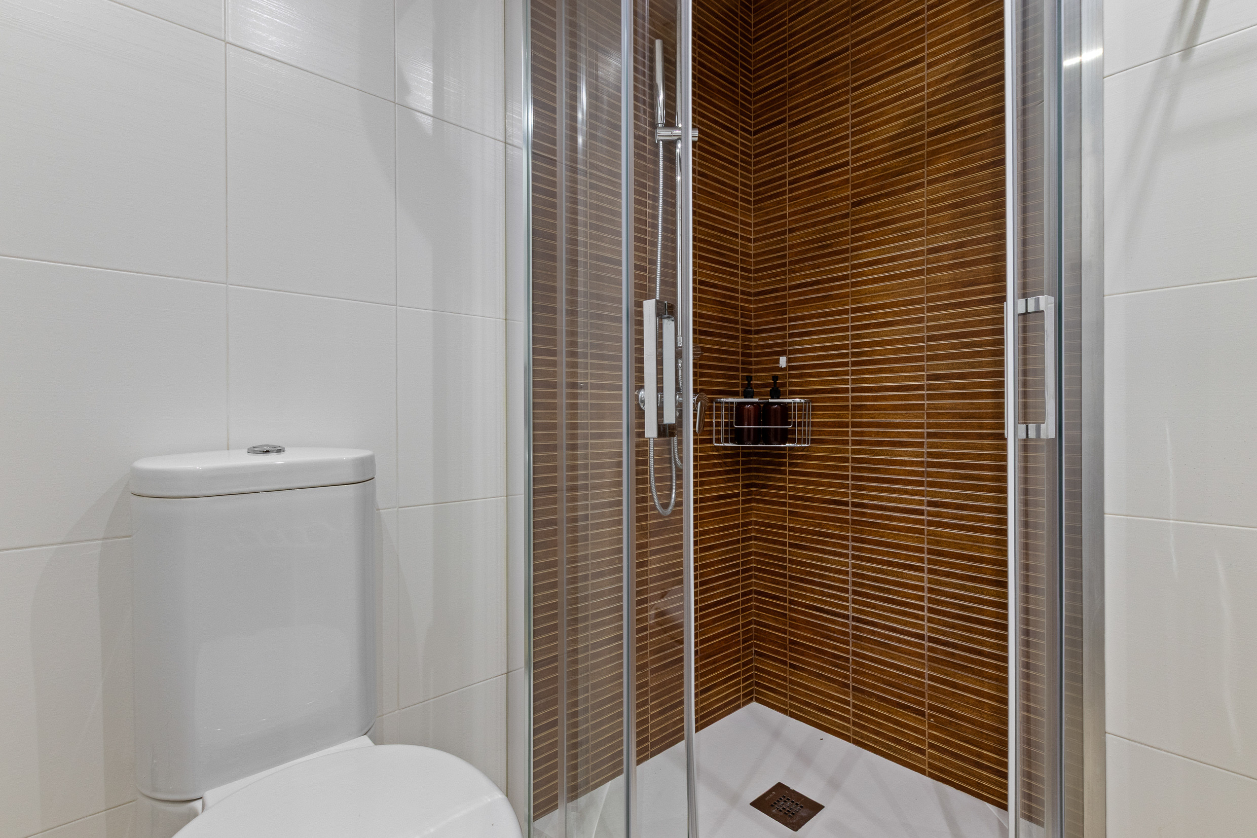 El baño, moderno y elegante, cuenta con una ducha espaciosa y un calentador de agua de gran capacidad, asegurando abundante agua caliente para una experiencia de baño relajante.
