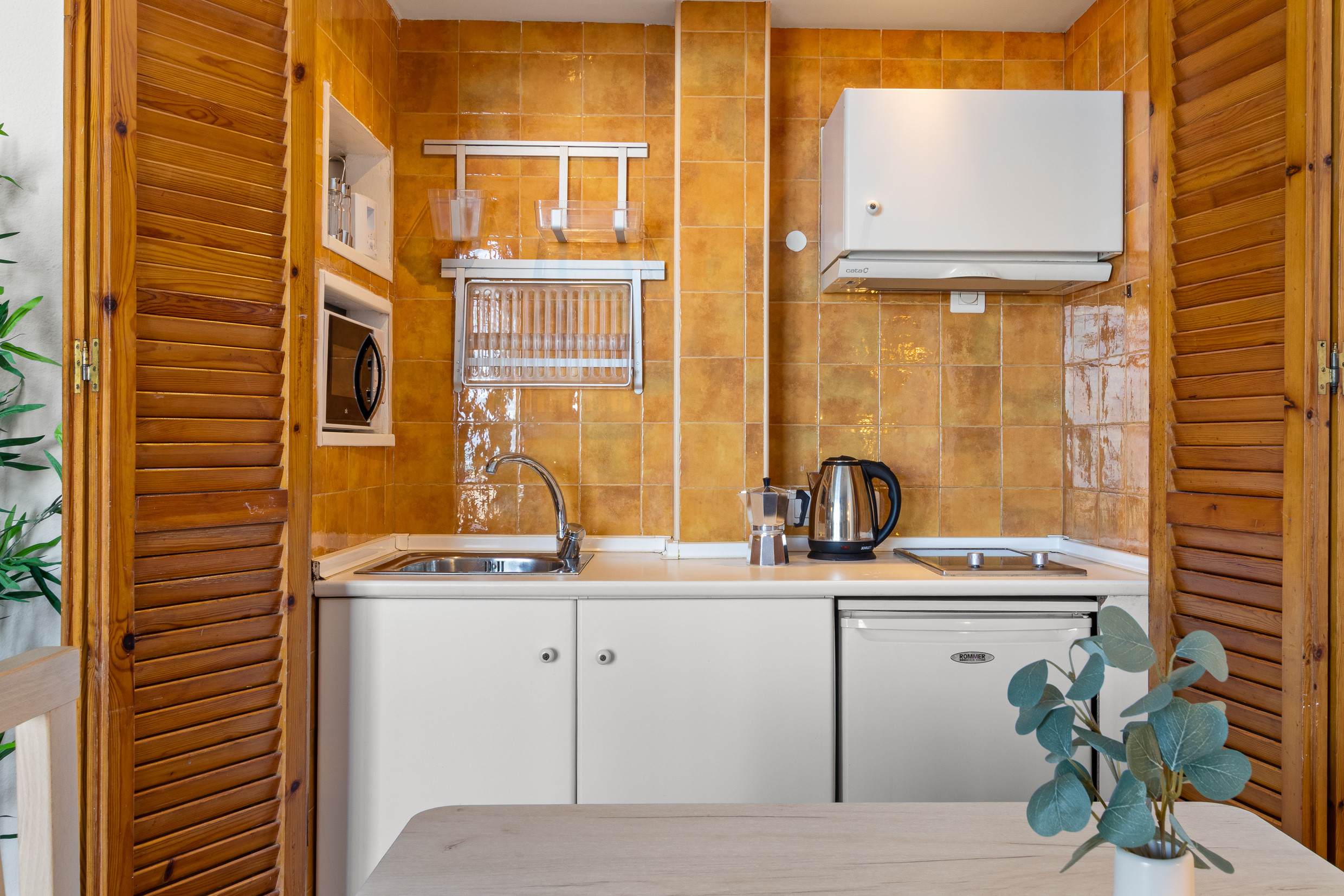 • Kitchen integrated into the living room, fully equipped to cook as if at home.
