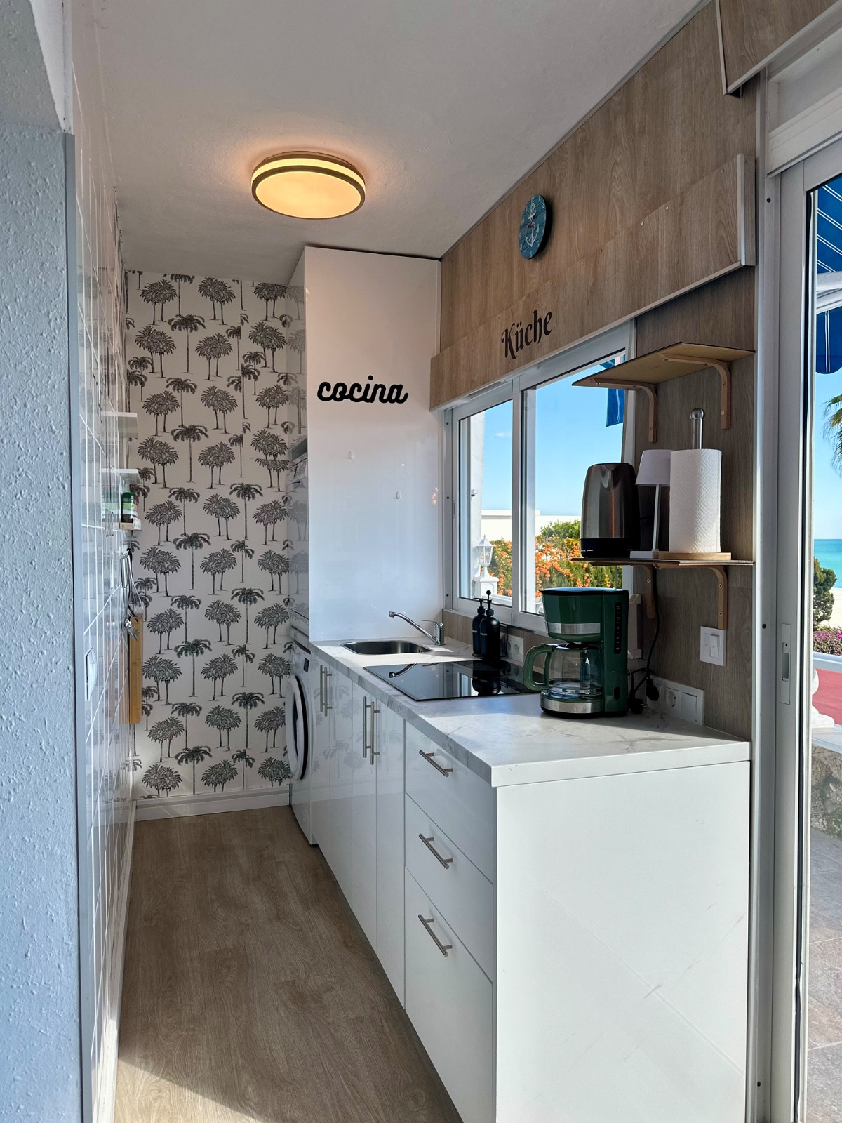 The living room has a large window that opens completely, offering a beautiful view of the sea and the swimming pool. It has air conditioning, a double sofa bed, and opaque curtains for greater privacy and comfort. The open-plan kitchen is integrated into the living room and equipped with everything necessary: large fridge, washing machine, microwave, ceramic hob, coffee maker, toaster, and complete kitchenware.